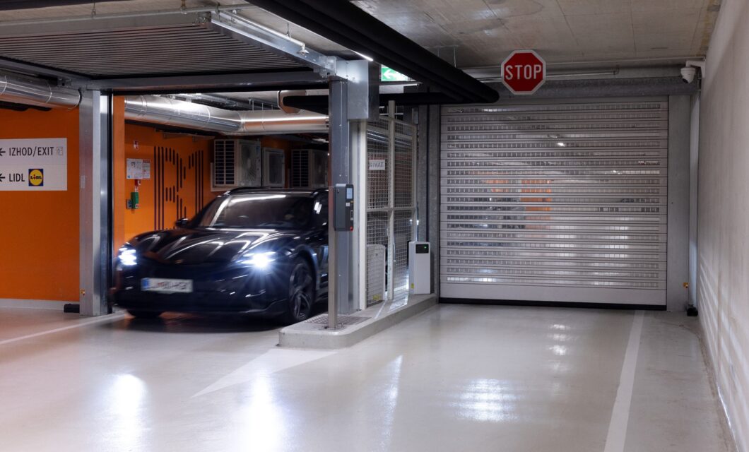 Drugi par vrat – EFA-SST PS-N – je nameščen v samem parkirišču in deluje kot funkcionalna pregrada med javnimi in zasebnimi conami. Ta vrata ločujejo stanovanjska, hotelska in naročniška parkirna območja od širše javnosti. Dostop se upravlja s sistemom kartic, ki zagotavlja, da uporabniki vstopajo le v pooblaščena območja, hkrati pa povečuje varnost in zasebnost v celotnem objektu.